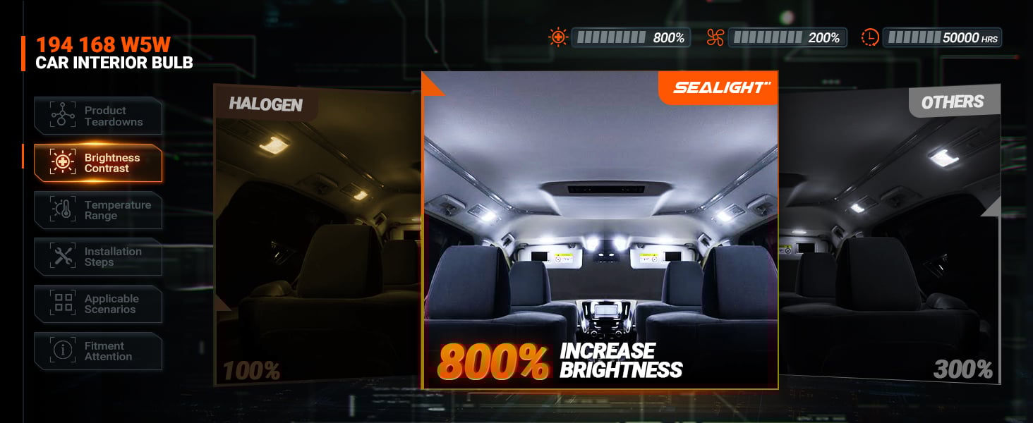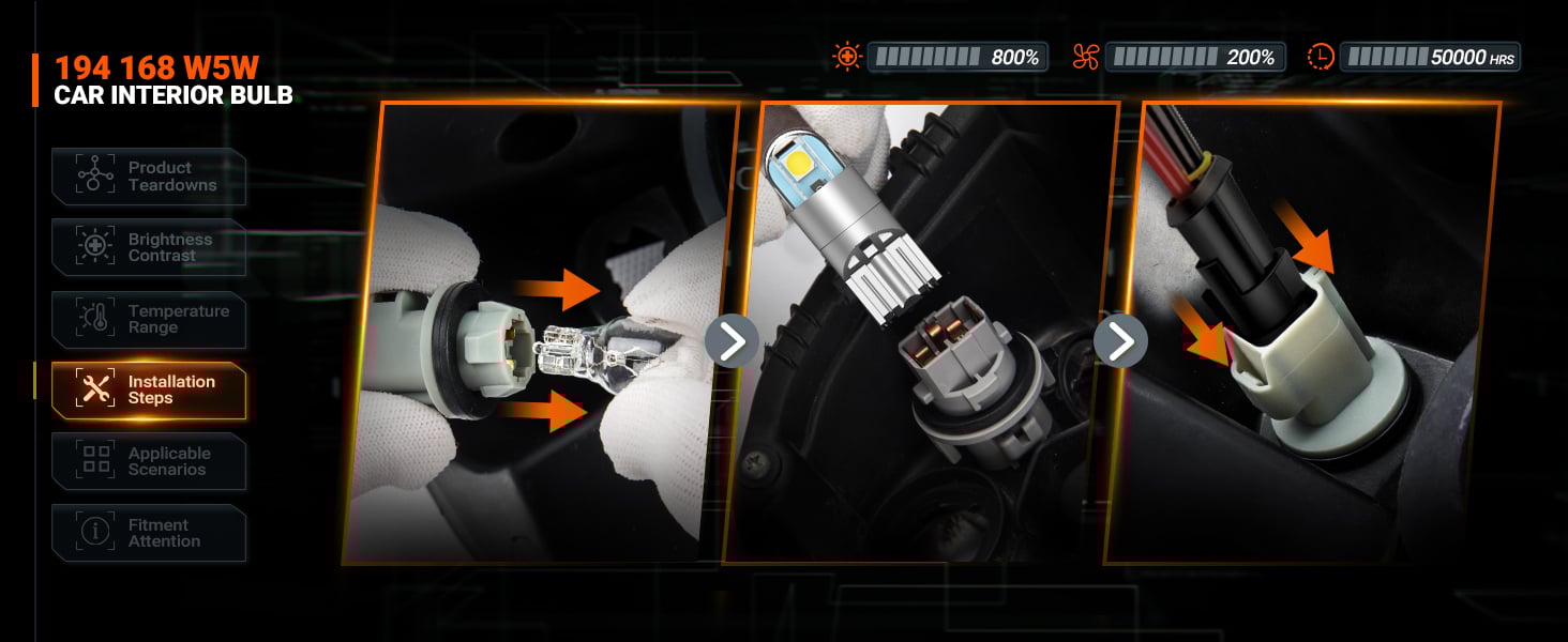 The sealed bulb is designed with reference to halogen lamps, achieving the same luminous positions and a perfect fit with a wedge-shaped base. No polarity, plug and play, installation within 5 minutes. - 50,000HRS Lifespan