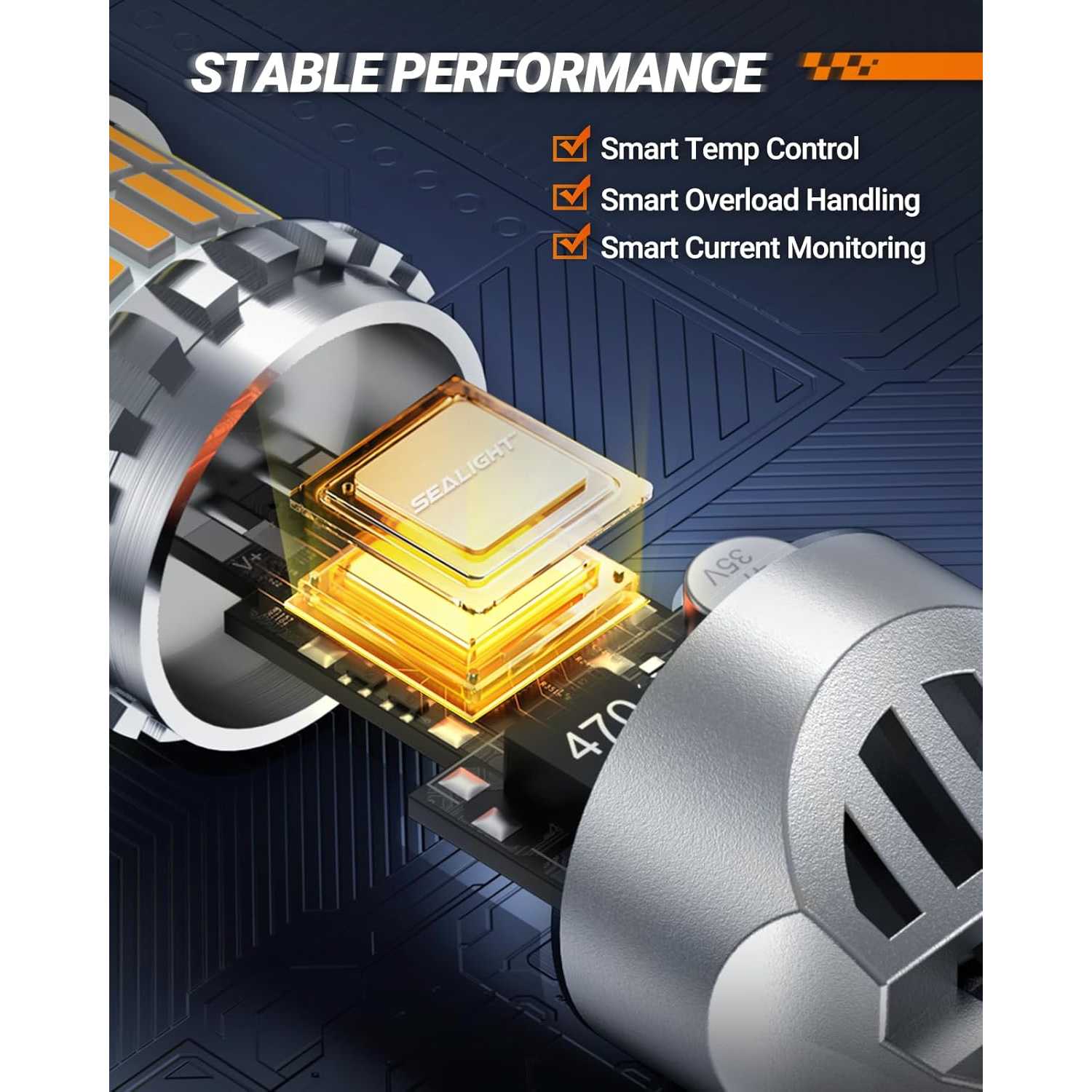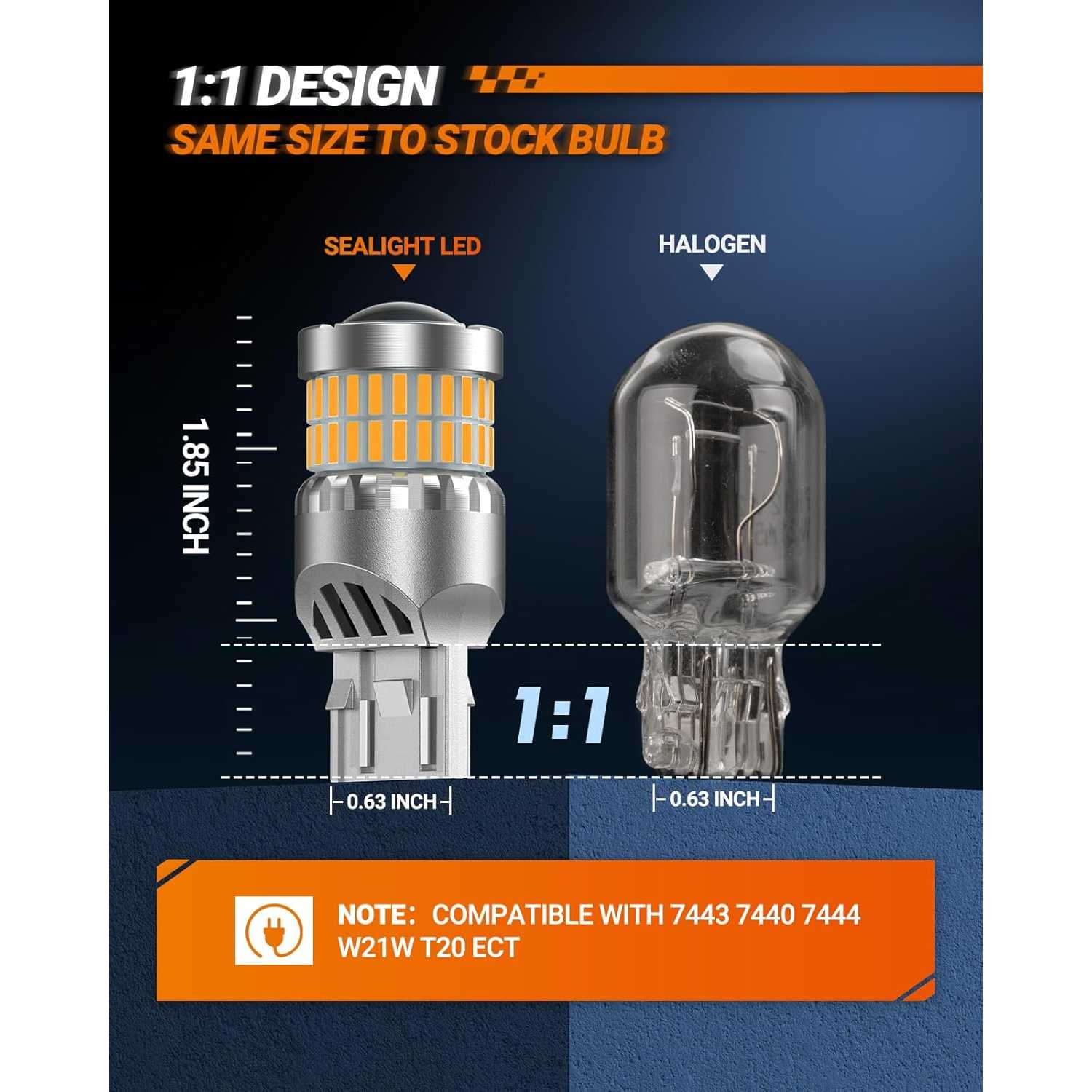 - (Super Bright & 360° Lighting)Featuring a combination of 56pcs 4014-SMD and 1pc 2835-SMD LED chips, SEALIGHT 7443 LED bulbs employs a 360° full-angle light-emitting design complemented by a lens. not only focuses the LED light source into a spotlight but also creates a uniform light spot, effectively eliminating localized over-brightness or dark areas.