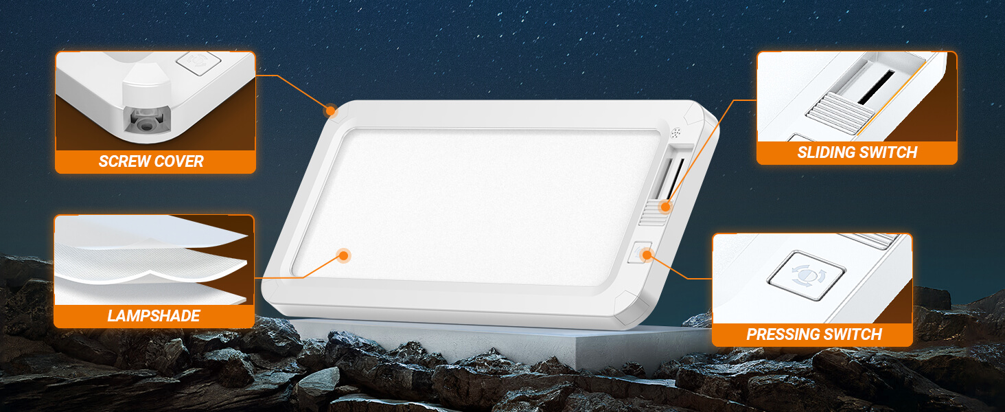 - (3 Color Modes & Stepless Dimming)The RV interior light is available in 3 colors - Cool White (6000K-6500K), Natural White (4000K-4500K) and Warm White (2900K-3100K). The slide switch adjusts the brightness from 20% to 100%.Press the switch button to adjust the color temperature and brightness, this RV light fixture can meet your different lighting needs.