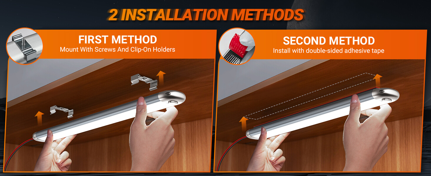 - (2 Installation Methods)Plug the 12V LED light into the truck, the red wire connects to "+" and the black wire connects to "-".First method: Tear off the firm double sided tape and stick it on the position you want.Second method: Use the clips and screws included in the package to fix the light bar in your desired position.
