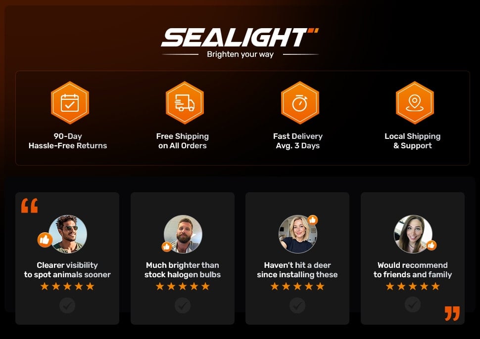 Thousands of drivers choose Sealight not just for brighter lighting, but for the confidence that comes with reliable service and real-world results. From hassle-free returns and fast local shipping to genuine feedback from drivers who’ve seen the difference on the road, this is trust built through experience — and shared with friends and family.