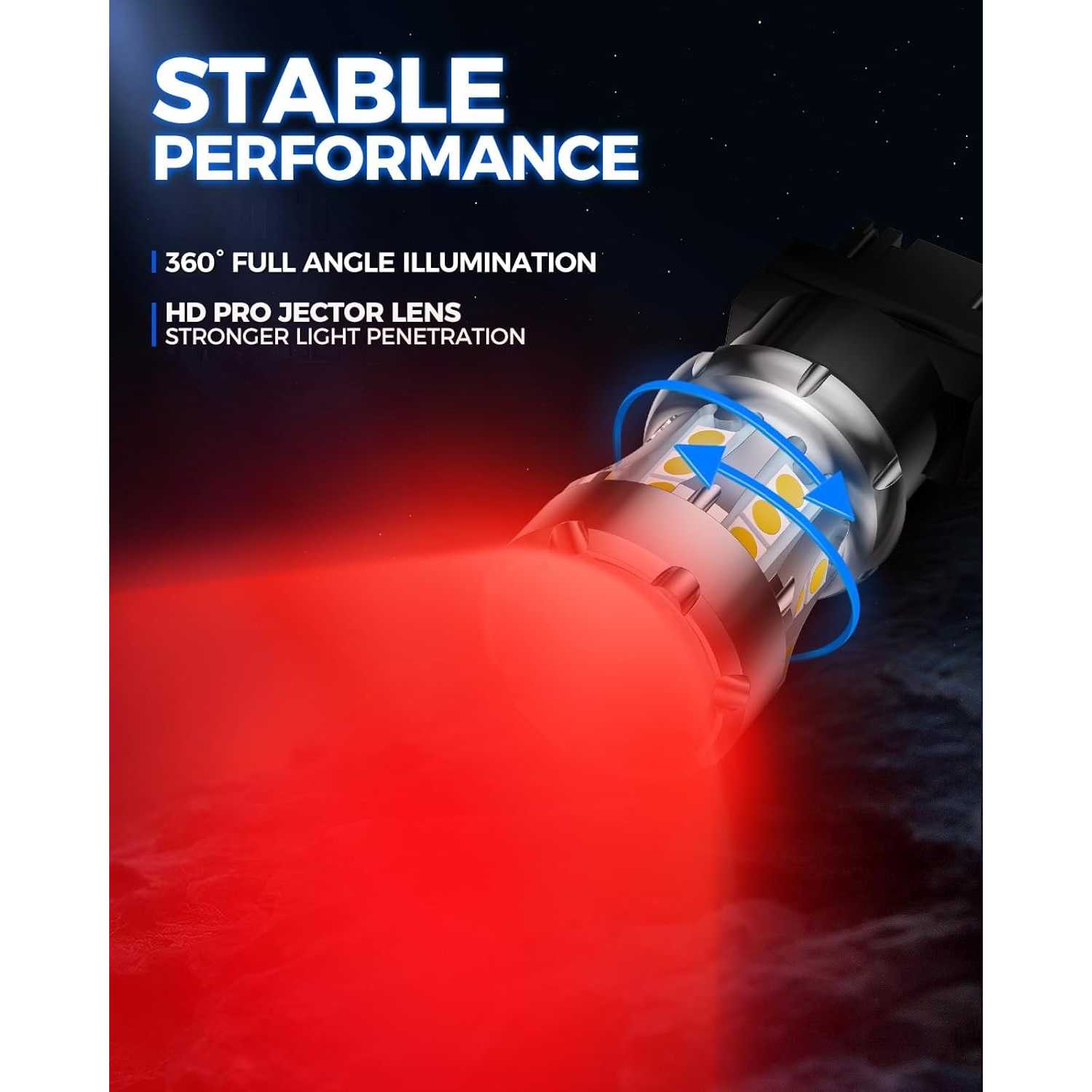 - (600% Brighter than Halogen) Each brake light bulb base 3156/3157 LED bulb is equipped with 24 PCS high brightness 3030-SMD chips. 3157 tail light bulb has 360°full angle illumination light output with projector lens design help you see more clearly and safely when stoping.