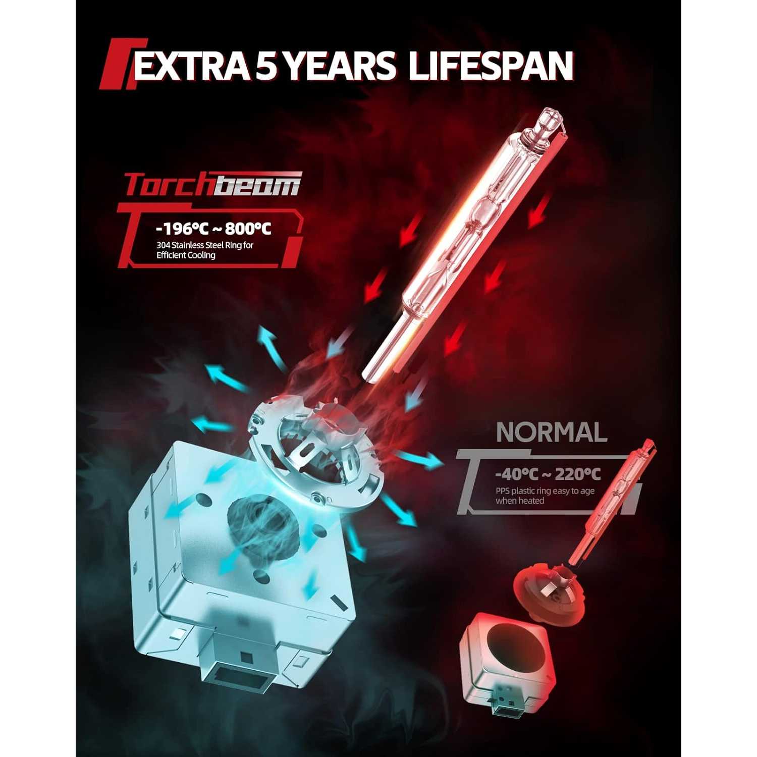 - 7000LM, 3X Brighter: With 7000 lumens and 6000K cool white light per pair bulbs, Torchbeam D8S HID lamps performs 300% brightness than halogen bulbs. Note: HID bulbs takes a few seconds to reach its brightest stage